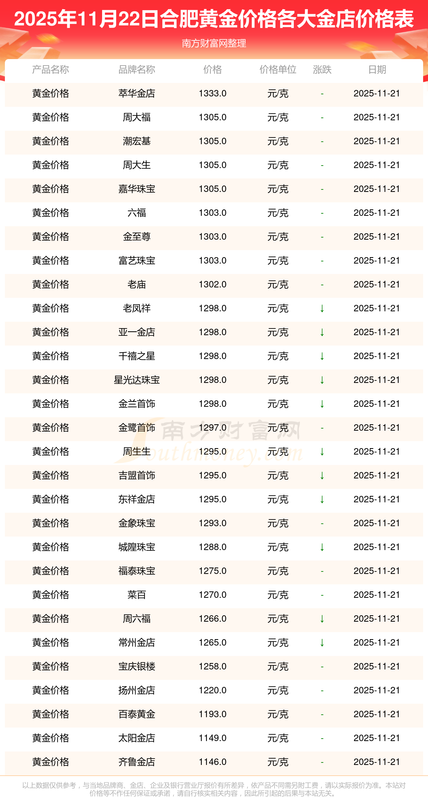一、2025年11月22日合肥各大金店黄金价格多少一克?合肥黄金价格多少钱一克?
