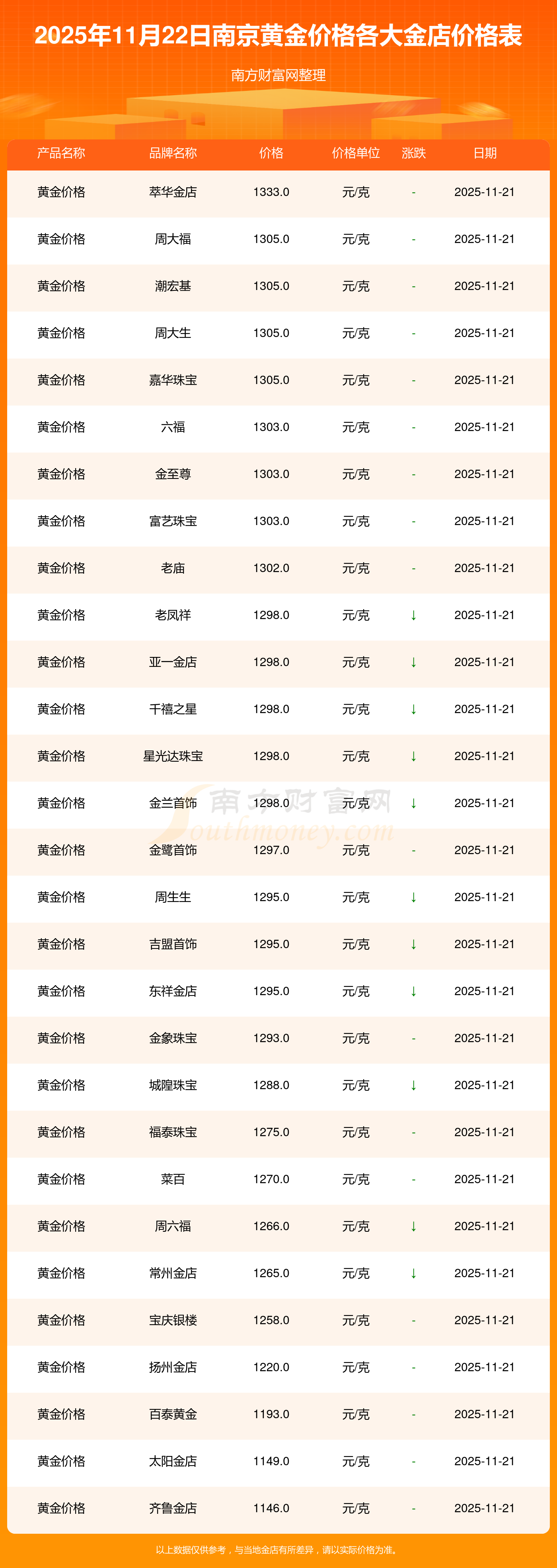 2025年11月22日,南京周大福、周大福、周大福、周大福、周大福、周大福、周大福、老凤祥、老凤祥、老凤祥、周六福等各大金店品牌黄金价格今日价格行情最新来了:周大福1305.0元/克、周大福616.0元/克、周大福1305.0元/克、周大福45110.0、周大福17570.0、周大福40690.0、周大福1143.0元/克、老凤祥1298.0元/克、老凤祥600.0元/克、老凤祥1298.0元/克、周六福1266.0元/克。
