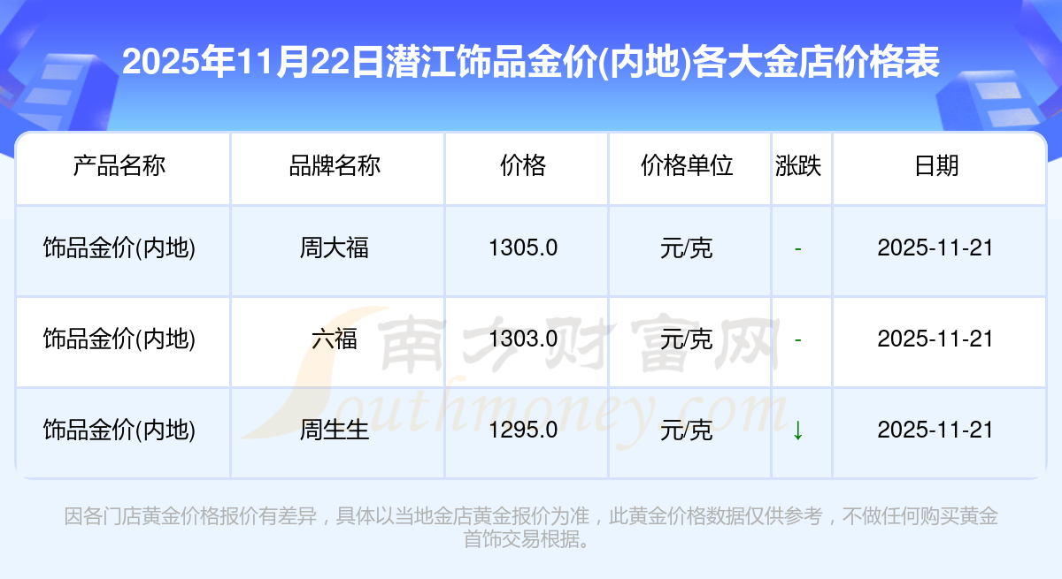 2025年11月22日潜江周大福、周大福、周大福、周大福、周大福、周大福、周大福、老凤祥、老凤祥、老凤祥、周六福等各大金店品牌饰品金价(内地)最新价格行情来了,如下:周大福黄金价格1305.0元/克,周大福铂金价格616.0元/克,周大福饰品金价(内地)1305.0元/克,周大福黄金饰品(香港)45110.0,周大福铂金价格(香港)17570.0,周大福金条价格(香港)40690.0,周大福金条金价(内地)1143.0元/克,老凤祥黄金价格1298.0元/克,老凤祥铂金价格600.0元/克,老凤祥足金价格1298.0元/克,周六福黄金价格1266.0元/克。