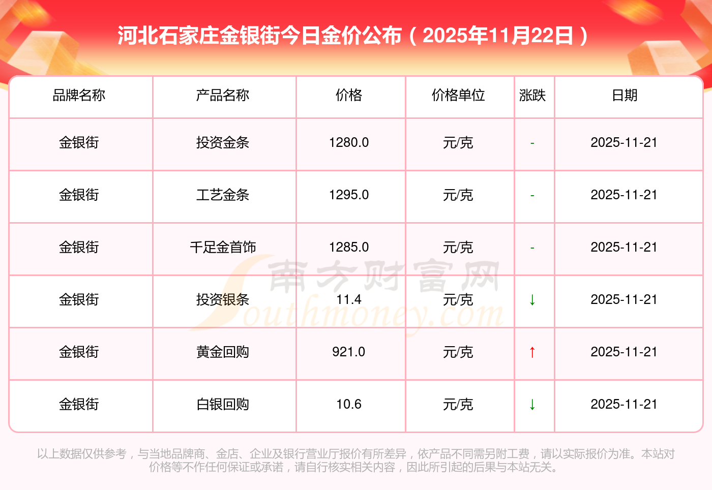 河北石家庄金银街金价今日价格:黄金价格1305.0元/克,铂金价格616.0元/克,饰品金价(内地)1305.0元/克,黄金饰品(香港)45110.0,铂金价格(香港)17570.0,金条价格(香港)40690.0,金条金价(内地)1143.0元/克,黄金价格1298.0元/克,铂金价格600.0元/克,足金价格1298.0元/克,黄金价格1266.0元/克。