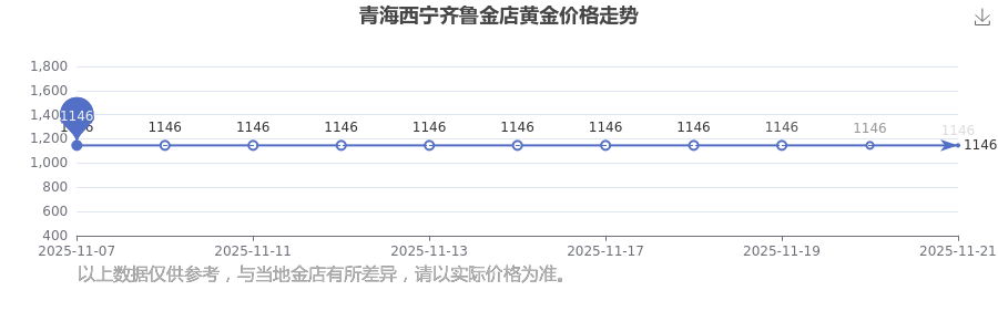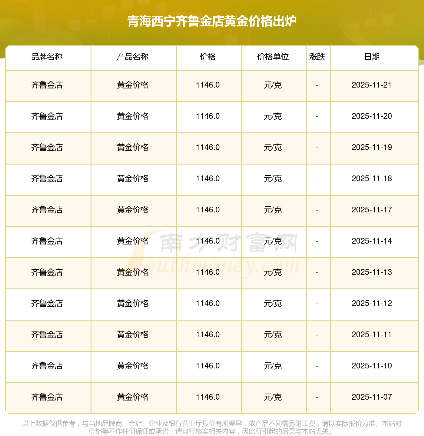 2025年11月22日青海西宁齐鲁金店黄金价格是1146.0元/克。