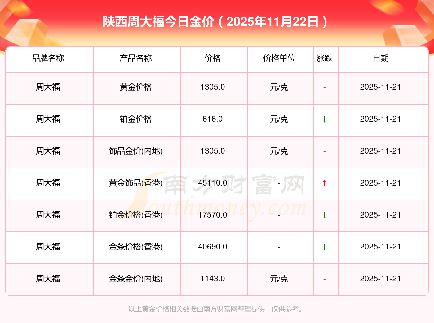 黄金价格1305.0元/克,铂金价格616.0元/克,饰品金价(内地)1305.0元/克,黄金饰品(香港)45110.0,铂金价格(香港)17570.0,金条价格(香港)40690.0,金条金价(内地)1143.0元/克,黄金价格1298.0元/克,铂金价格600.0元/克,足金价格1298.0元/克,黄金价格1266.0元/克。