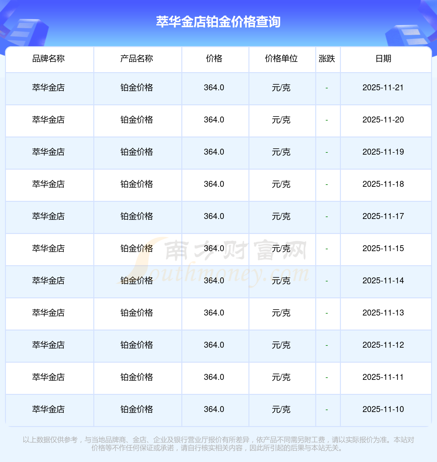 今日萃华金店 铂金价格的最新定价为364.0元/克。