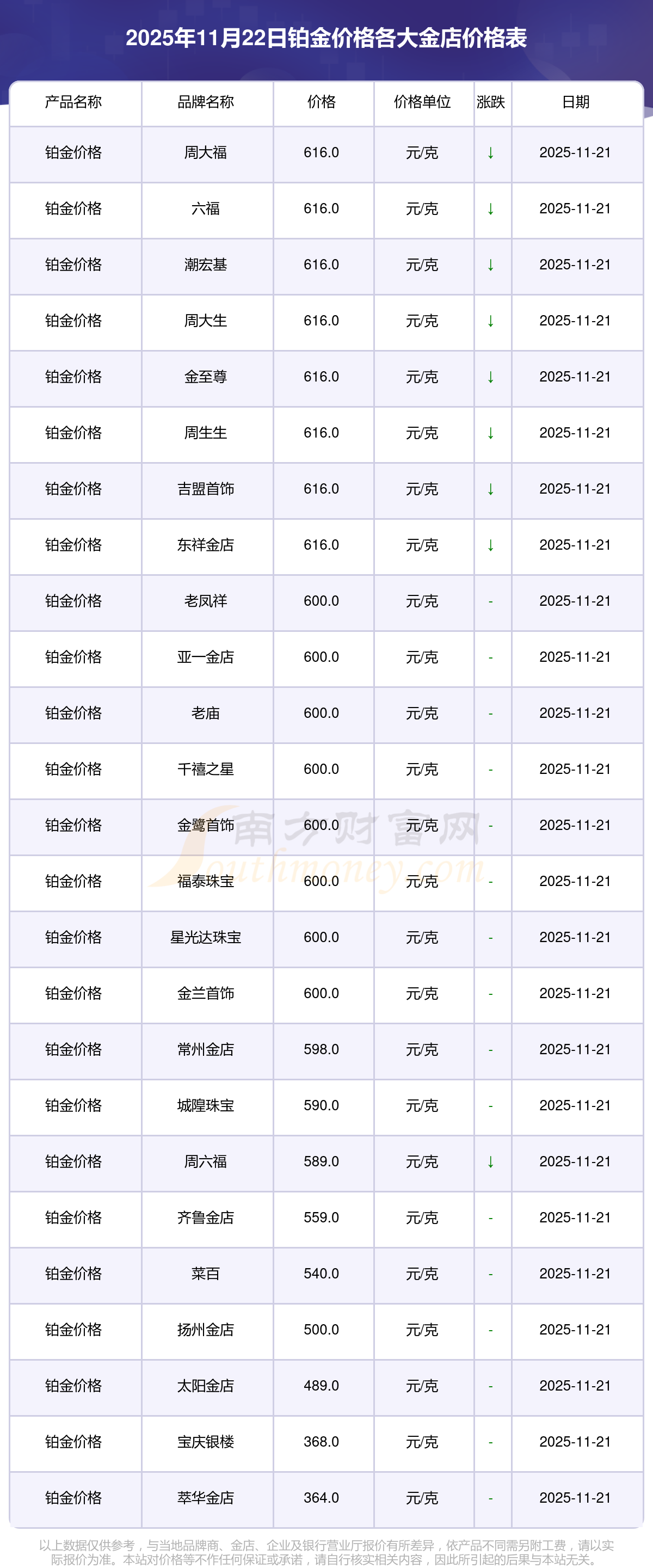 2025年11月22日各大金店铂金价格最新价格:周大福1305.0元/克,周大福616.0元/克,周大福1305.0元/克,周大福45110.0,周大福17570.0,周大福40690.0,周大福1143.0元/克,老凤祥1298.0元/克,老凤祥600.0元/克,老凤祥1298.0元/克,周六福1266.0元/克。