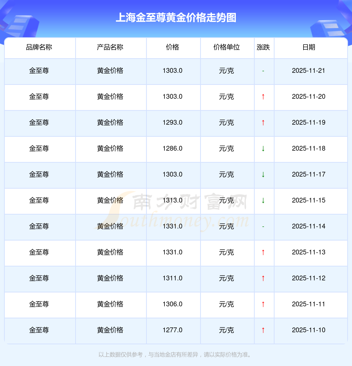 今日(2025年11月22日),上海金至尊黄金价格:1303.0元/克。