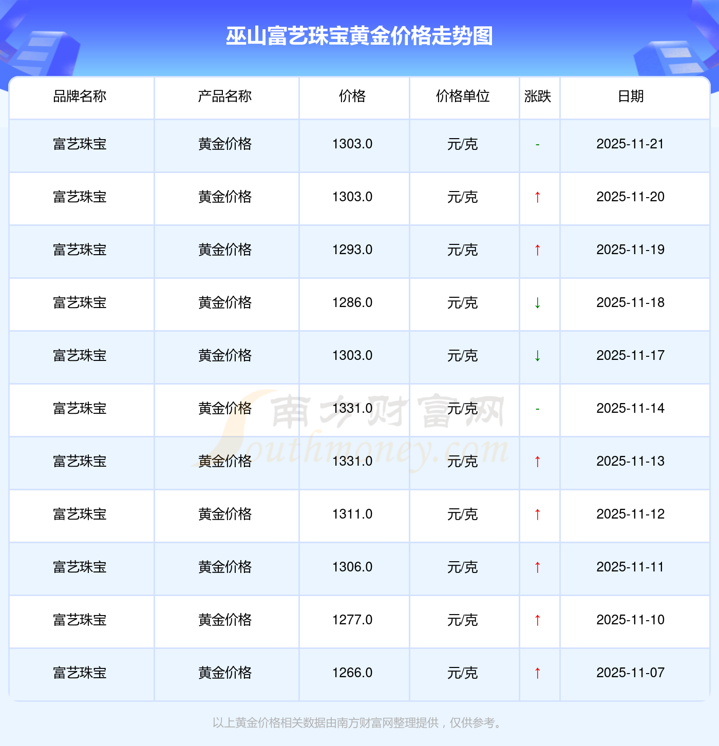 今天黄金每克的价值是多少?今日巫山富艺珠宝黄金价格查询,巫山富艺珠宝黄金价格在 2025年11月22日,其市场价格为 1303.0元/克。
