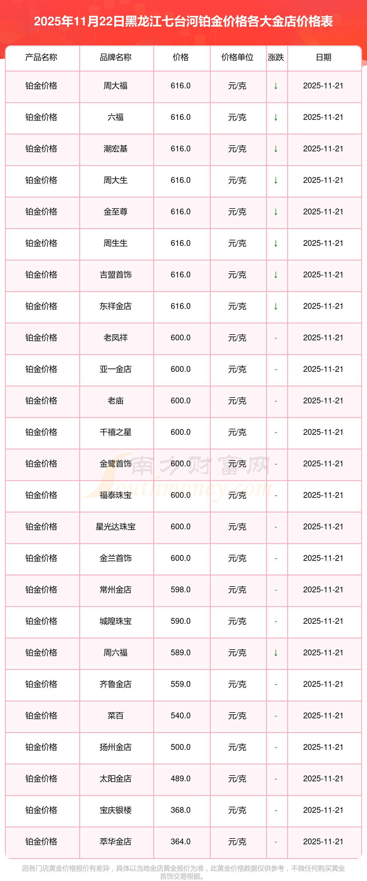 2025年11月22日,黑龙江七台河周大福、周大福、周大福、周大福、周大福、周大福、周大福、老凤祥、老凤祥、老凤祥、周六福等各大金店品牌铂金价格今日价格行情最新来了:周大福1305.0元/克、周大福616.0元/克、周大福1305.0元/克、周大福45110.0、周大福17570.0、周大福40690.0、周大福1143.0元/克、老凤祥1298.0元/克、老凤祥600.0元/克、老凤祥1298.0元/克、周六福1266.0元/克。