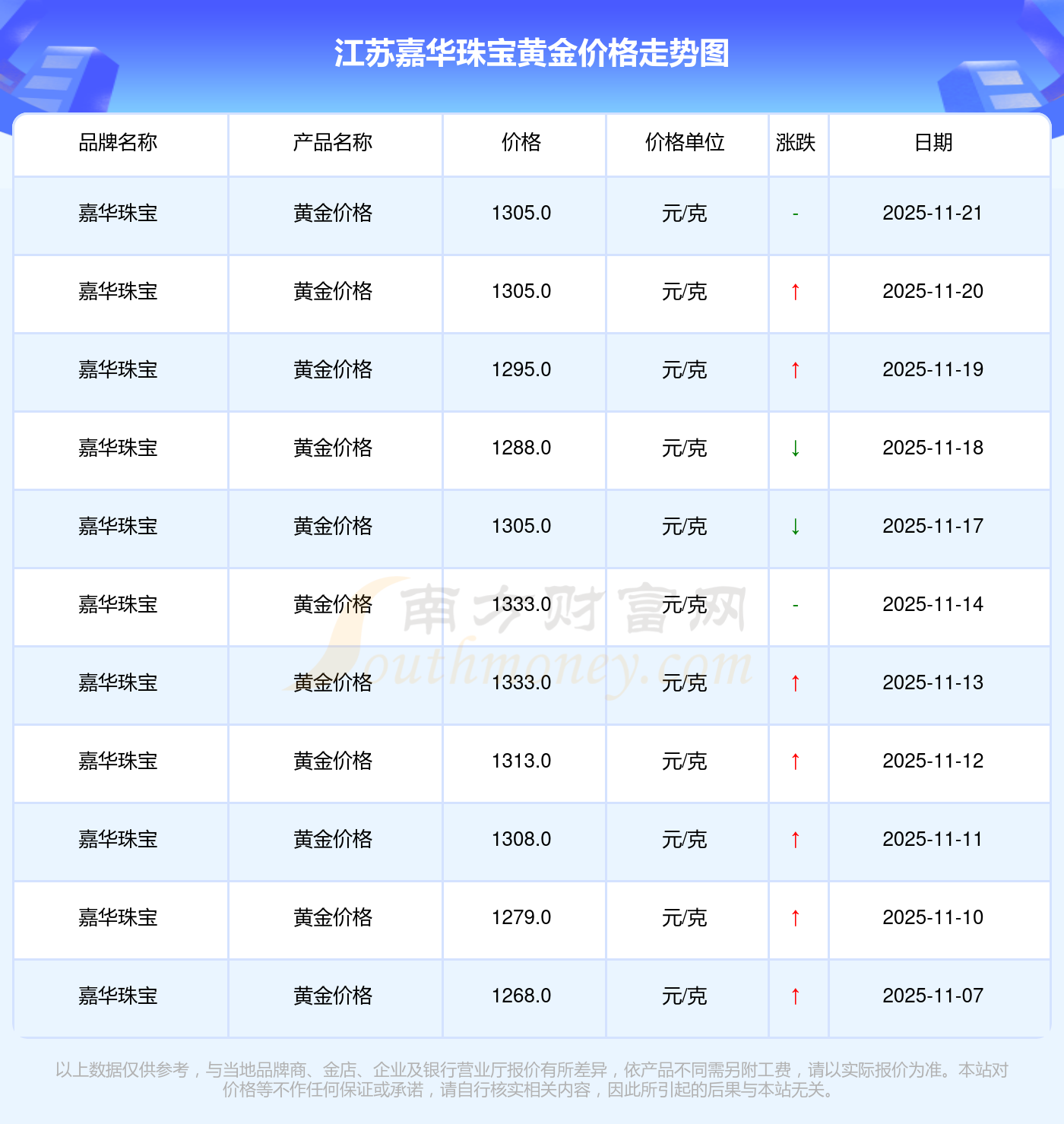 今日(2025年11月22日),1305.0元/克是江苏嘉华珠宝黄金价格的价格标准。