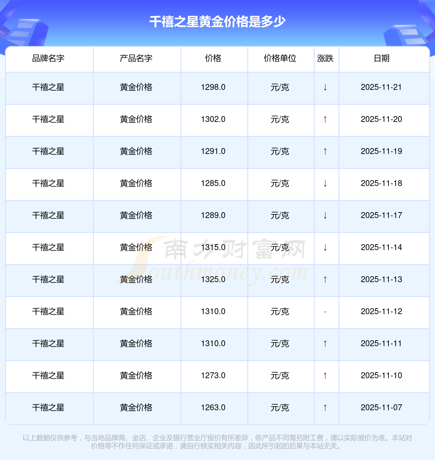 2025年11月22日千禧之星黄金价格:1298.0元/克。