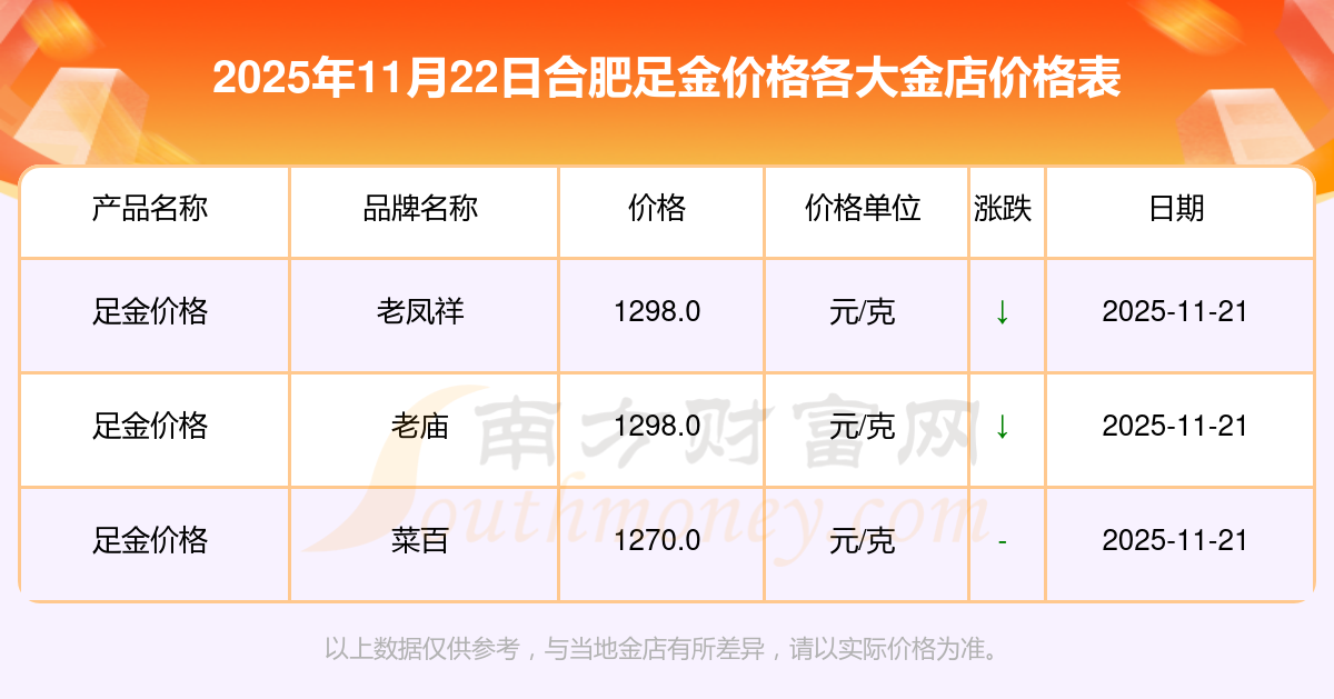 2025年11月22日合肥各大金店足金价格最新价格:周大福1305.0元/克,周大福616.0元/克,周大福1305.0元/克,周大福45110.0,周大福17570.0,周大福40690.0,周大福1143.0元/克,老凤祥1298.0元/克,老凤祥600.0元/克,老凤祥1298.0元/克,周六福1266.0元/克。