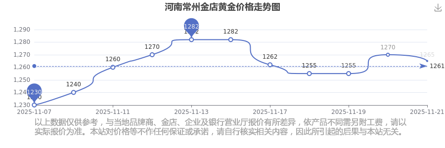 2025年11月22日河南常州金店黄金价格为1265.0元/克。