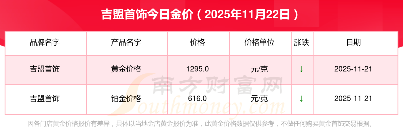 2025年11月22日,周大福、周大福、周大福、周大福、周大福、周大福、周大福、老凤祥、老凤祥、老凤祥、周六福等各大金店品牌黄金价格今日价格如下:周大福1305.0元/克、周大福616.0元/克、周大福1305.0元/克、周大福45110.0、周大福17570.0、周大福40690.0、周大福1143.0元/克、老凤祥1298.0元/克、老凤祥600.0元/克、老凤祥1298.0元/克、周六福1266.0元/克。