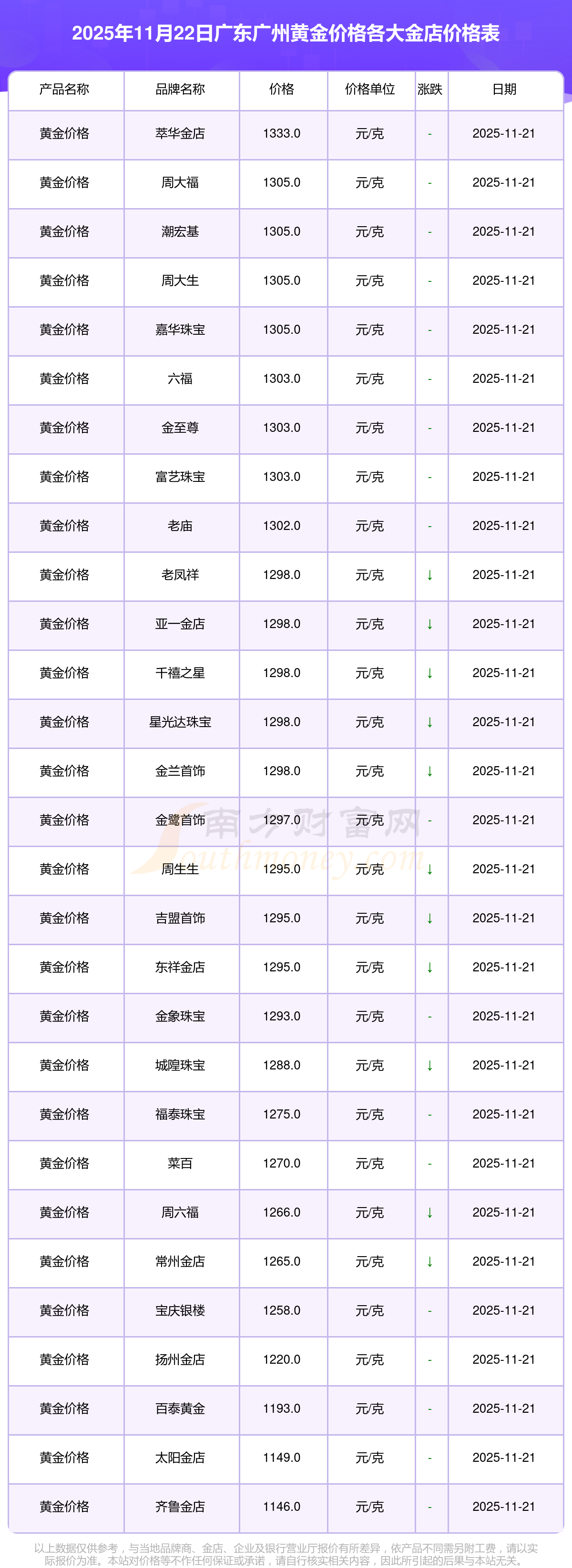 2025年11月22日,广东广州周大福、周大福、周大福、周大福、周大福、周大福、周大福、老凤祥、老凤祥、老凤祥、周六福等各大金店品牌黄金价格今日价格行情最新来了:周大福1305.0元/克、周大福616.0元/克、周大福1305.0元/克、周大福45110.0、周大福17570.0、周大福40690.0、周大福1143.0元/克、老凤祥1298.0元/克、老凤祥600.0元/克、老凤祥1298.0元/克、周六福1266.0元/克。