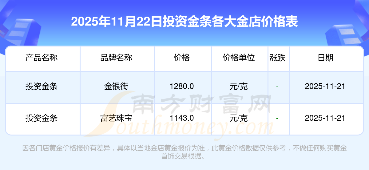 投资金条最高的金店是金银街,报价1280.0元/克,最低的是富艺珠宝,报价1143.0元/克。今日投资金条高低差为137元/克。
