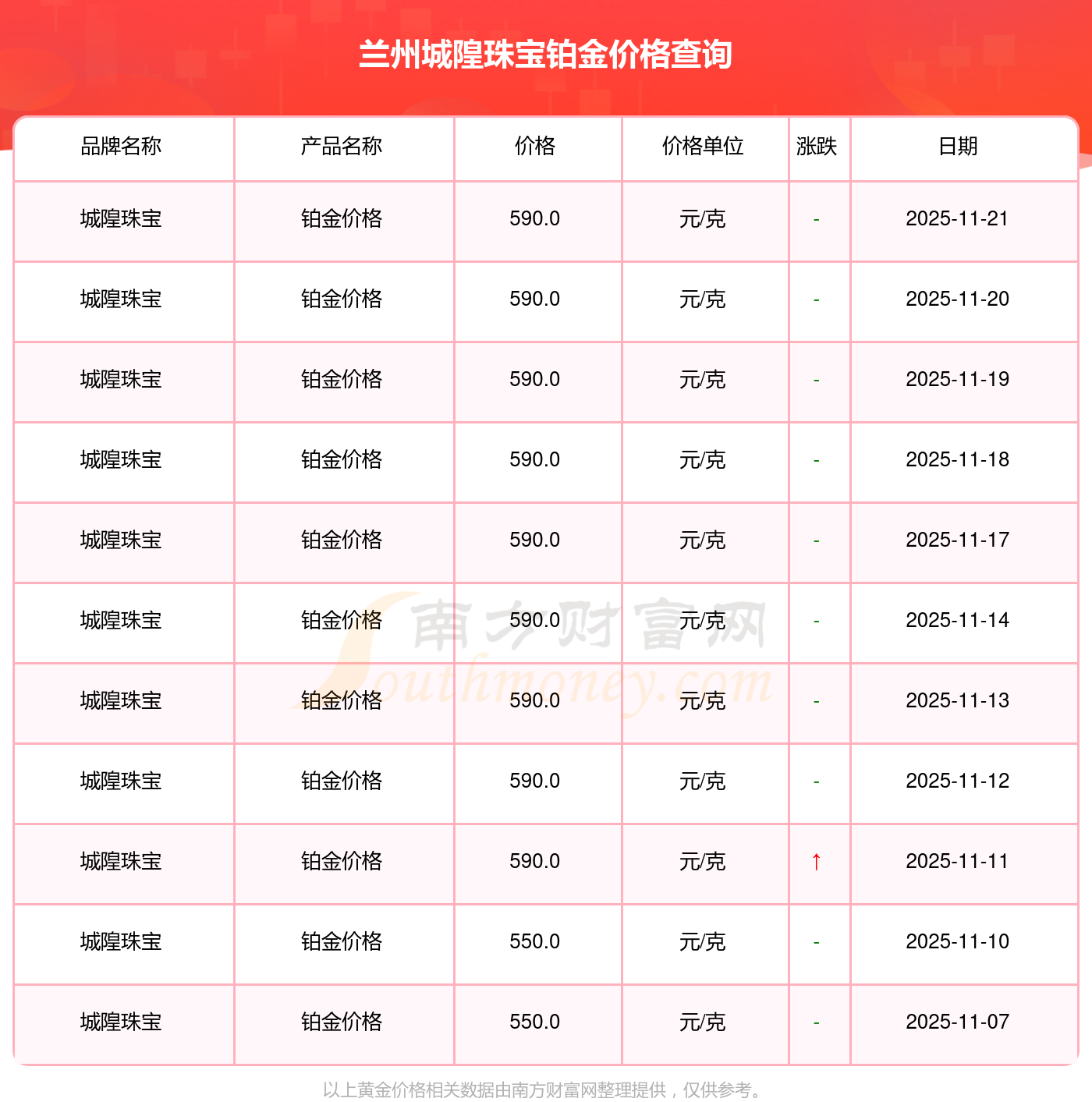 590.0元/克,这是兰州城隍珠宝于 2025年11月22日所定的铂金价格。