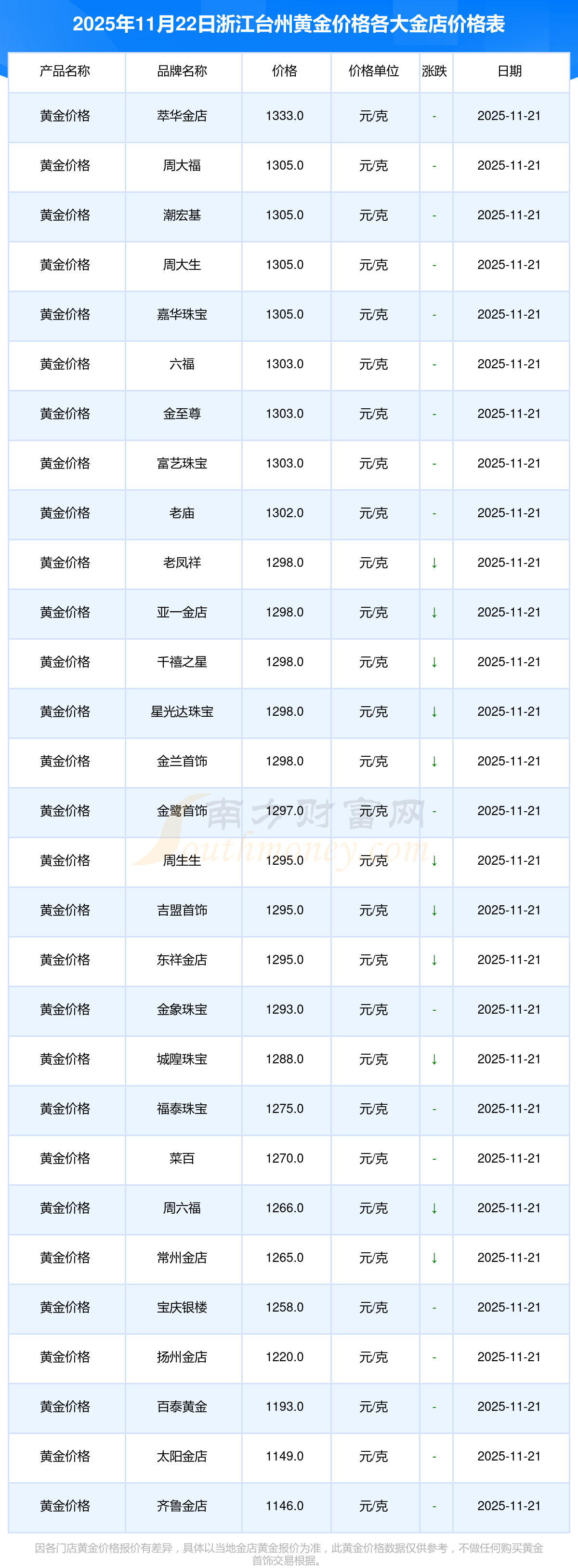 2025年11月22日浙江台州各大金店黄金价格最新价格查询来了:周大福1305.0元/克,周大福616.0元/克,周大福1305.0元/克,周大福45110.0,周大福17570.0,周大福40690.0,周大福1143.0元/克,老凤祥1298.0元/克,老凤祥600.0元/克,老凤祥1298.0元/克,周六福1266.0元/克。