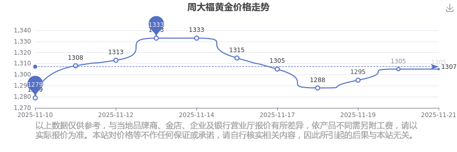 想查询今天黄金价格,此刻黄金一克的价格是多少呀?黄金属于优良的导电导热材料,具备良好的导热特性。由于化学稳定性高、抗氧化性强,可制作高精度电子元件,所以常被用在电子工业的特殊电路设计中。今日(2025年11月22日)周大福黄金价格是1305.0元/克。