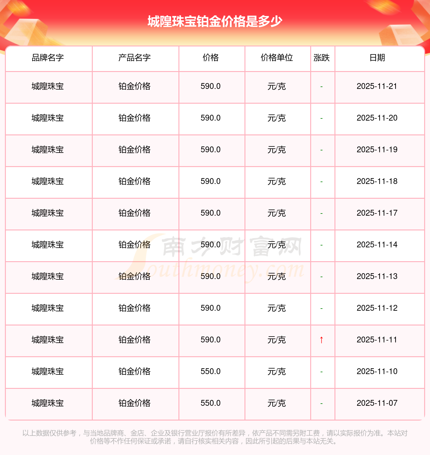 2025年11月22日城隍珠宝铂金价格是590.0元/克。