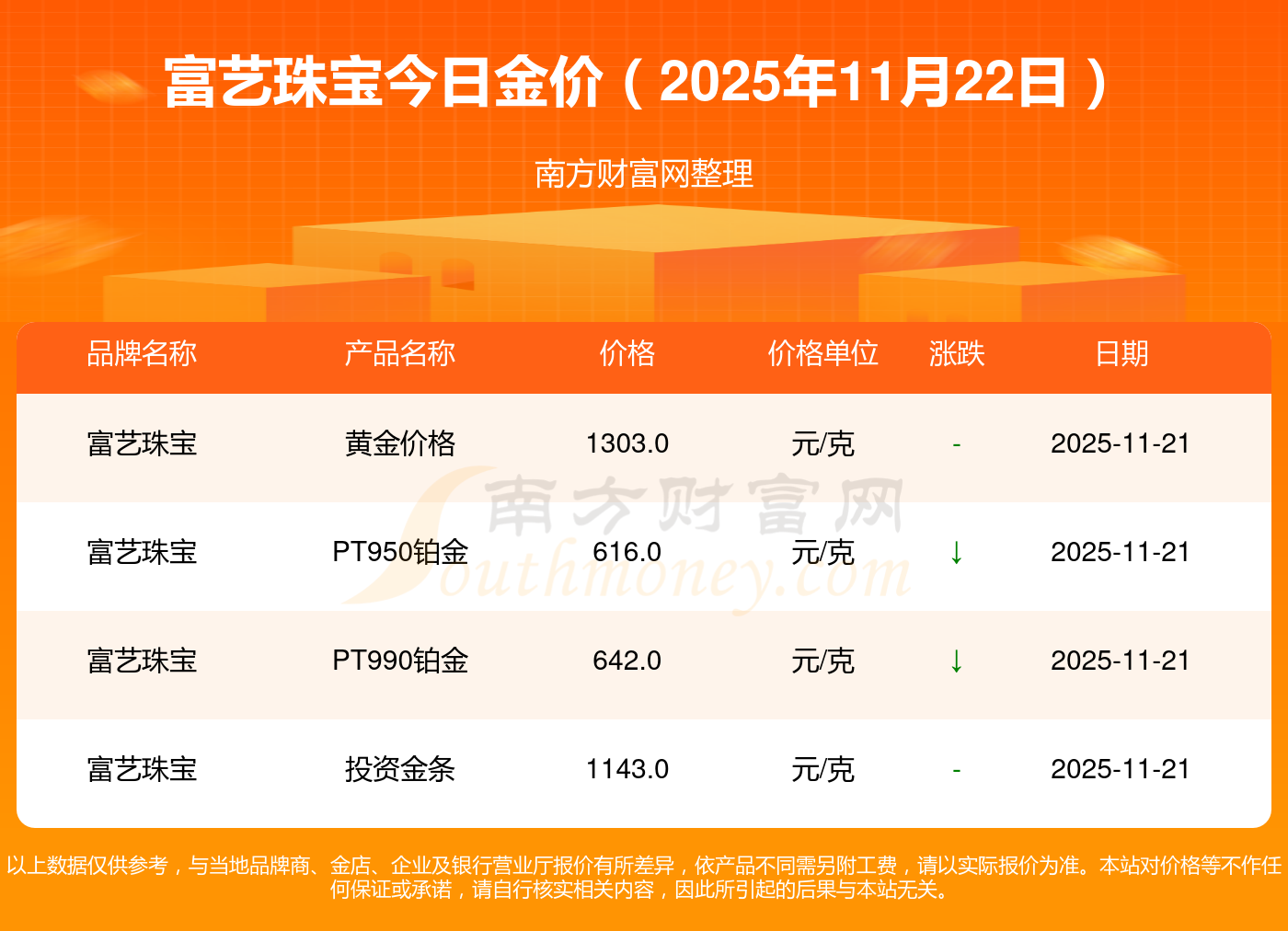2025年11月22日各大金店黄金价格最新价格:周大福1305.0元/克,周大福616.0元/克,周大福1305.0元/克,周大福45110.0,周大福17570.0,周大福40690.0,周大福1143.0元/克,老凤祥1298.0元/克,老凤祥600.0元/克,老凤祥1298.0元/克,周六福1266.0元/克。