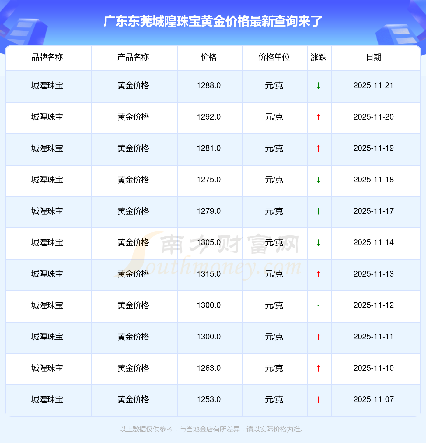 今日广东东莞城隍珠宝黄金价格查询,今日(2025年11月22日),广东东莞城隍珠宝黄金价格:1288.0元/克。