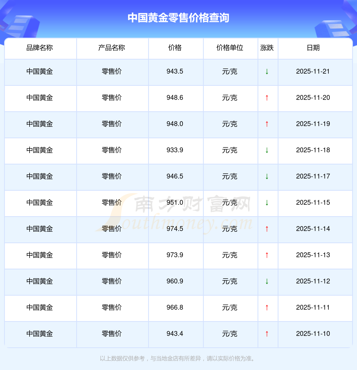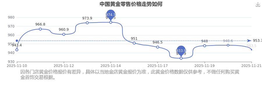 最新数据表明,中国黄金今日 零售价格为943.5元/克。