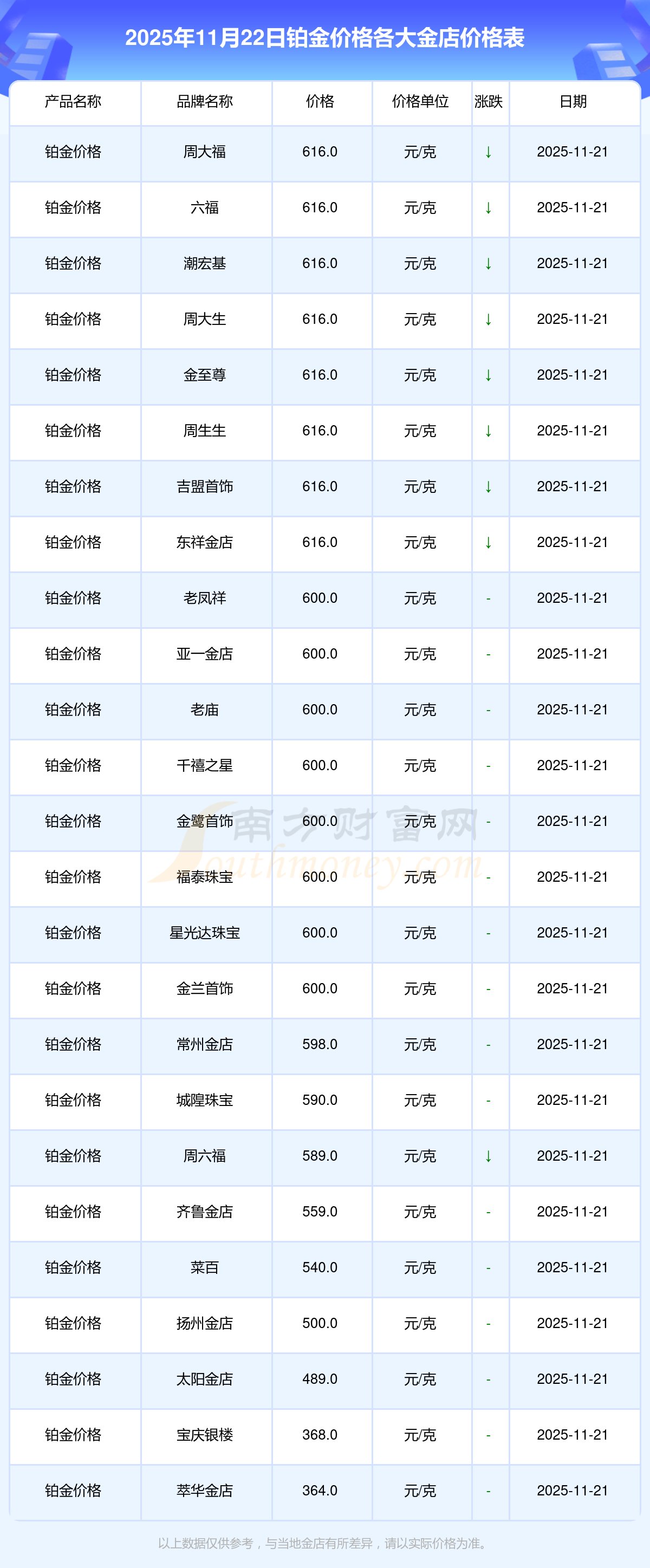今天是2025年11月22日,周大福、周大福、周大福、周大福、周大福、周大福、周大福、老凤祥、老凤祥、老凤祥、周六福等各大金店品牌铂金价格最新价格如下:周大福1305.0元/克、周大福616.0元/克、周大福1305.0元/克、周大福45110.0、周大福17570.0、周大福40690.0、周大福1143.0元/克、老凤祥1298.0元/克、老凤祥600.0元/克、老凤祥1298.0元/克、周六福1266.0元/克。