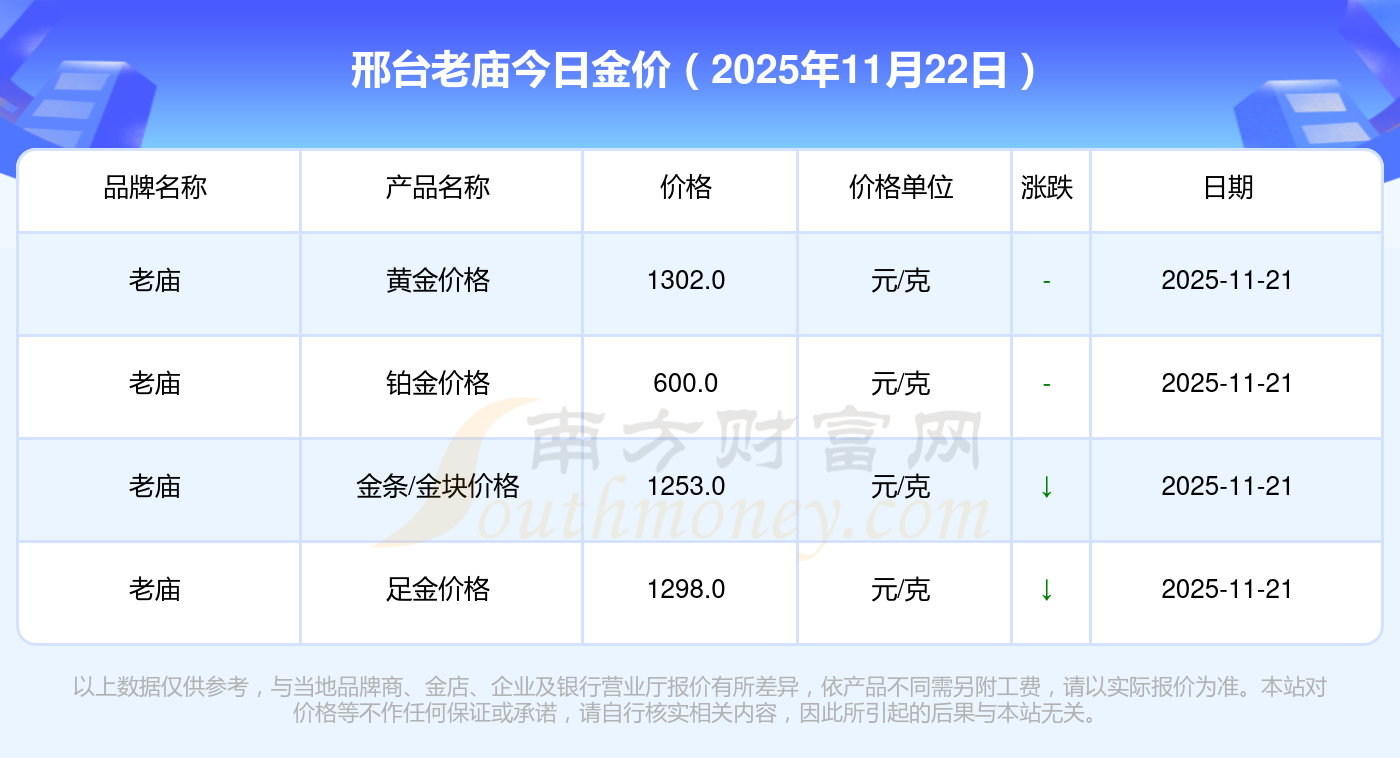 2025年11月22日邢台老庙黄金的单价,一克为多少?黄金价格1305.0元/克,铂金价格616.0元/克,饰品金价(内地)1305.0元/克,黄金饰品(香港)45110.0,铂金价格(香港)17570.0,金条价格(香港)40690.0,金条金价(内地)1143.0元/克,黄金价格1298.0元/克,铂金价格600.0元/克,足金价格1298.0元/克,黄金价格1266.0元/克。