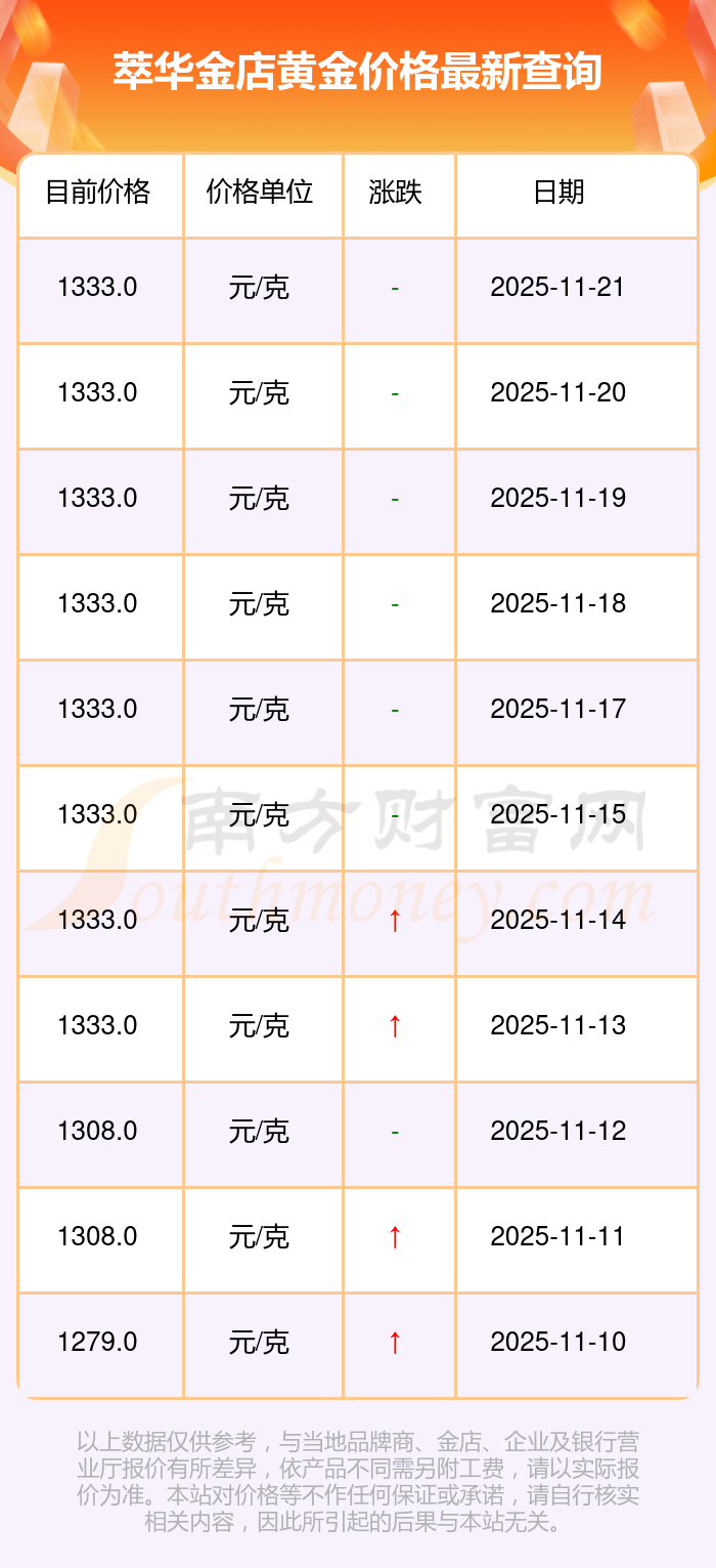 萃华金店 黄金价格于今日的最新挂牌价为1333.0元/克。