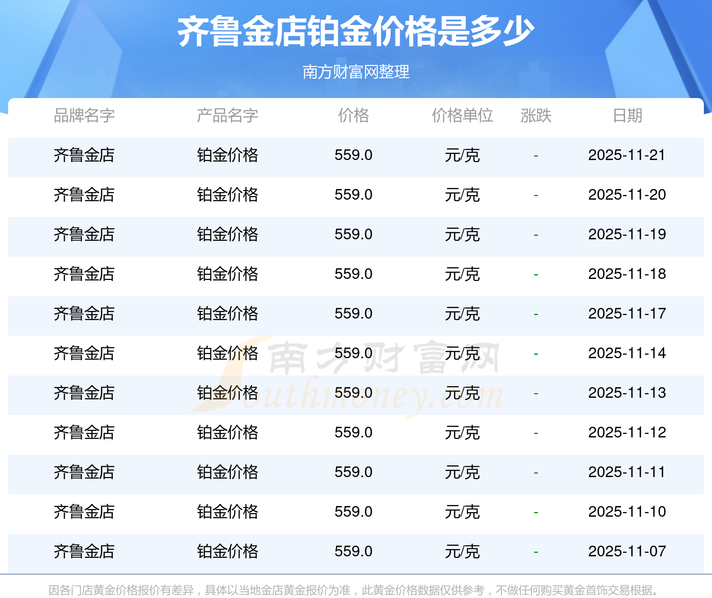 2025年11月22日齐鲁金店铂金价格最新为559.0元/克。