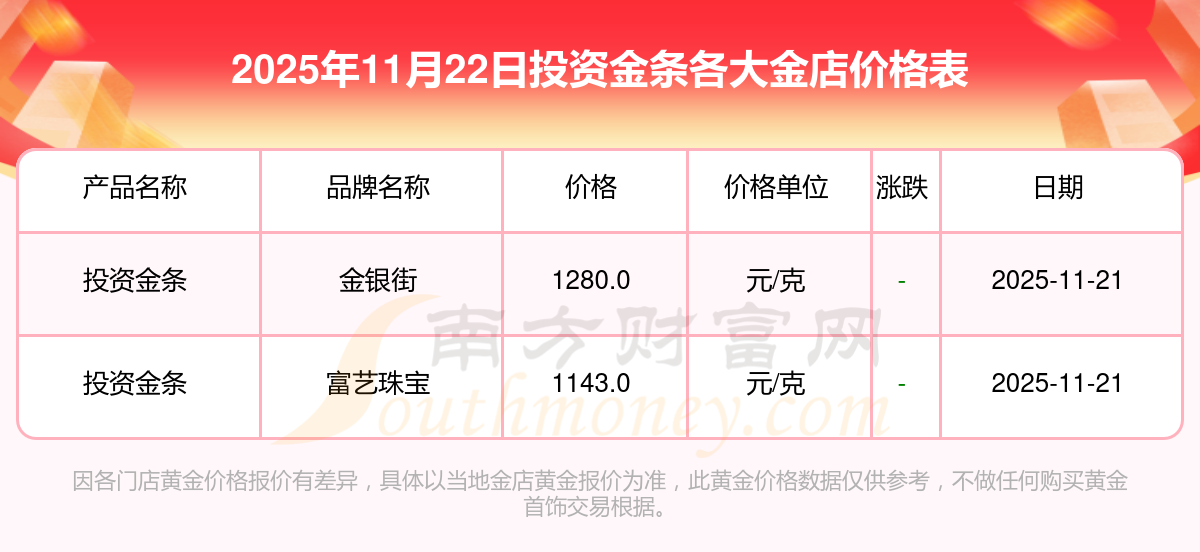 目前,投资金条最高的金店为金银街,报价1280.0元/克。而投资金条最低的金店是富艺珠宝,报价1143.0元/克。今日投资金条高低差为137元/克。