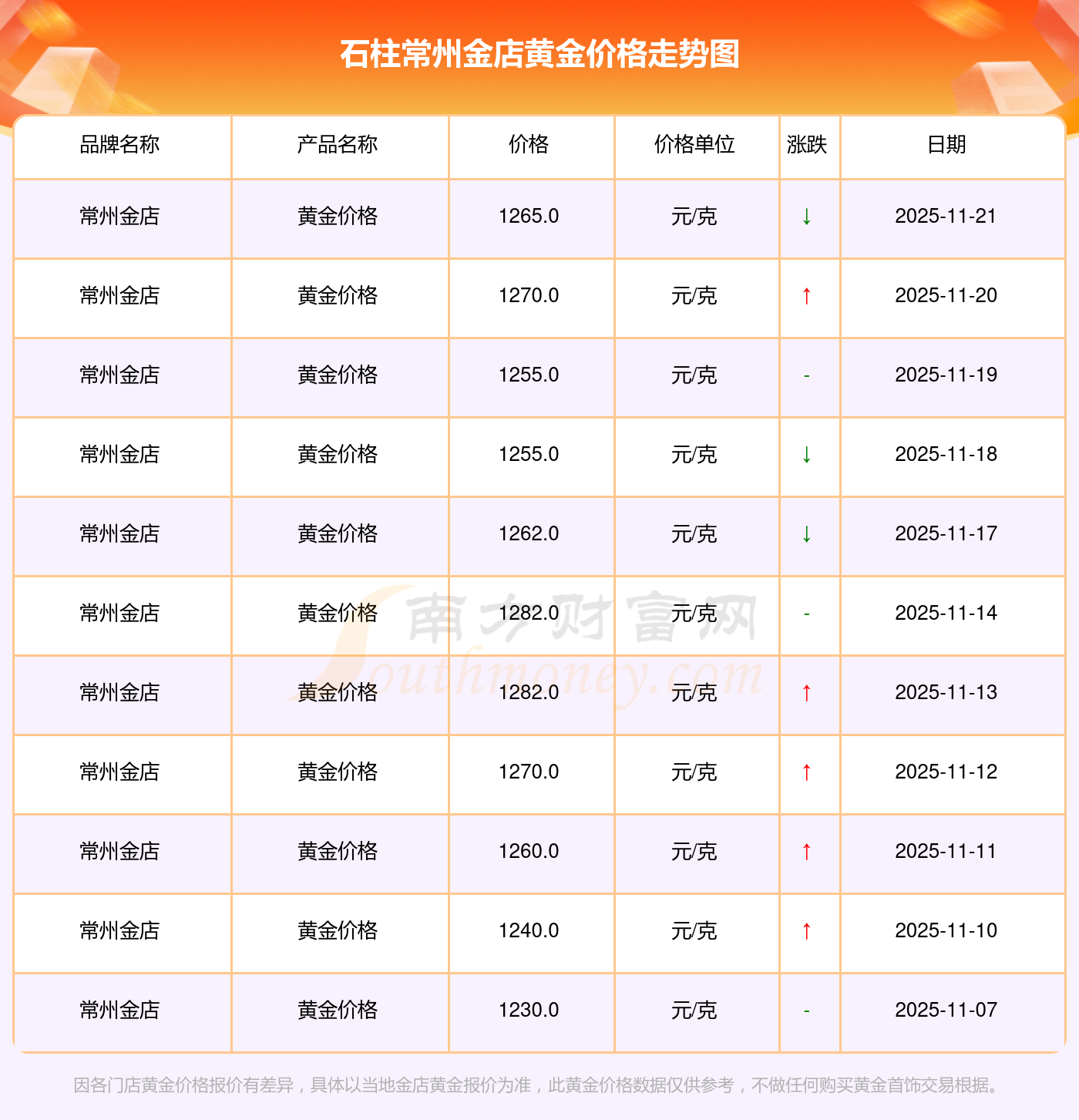 石柱常州金店黄金价格现在每克多少钱,今日黄金一克的标价是多少?今日石柱常州金店黄金价格查询,今日(2025年11月22日),石柱常州金店黄金价格:1265.0元/克。