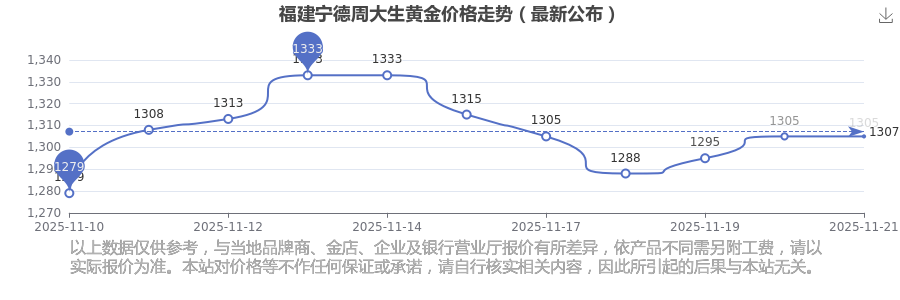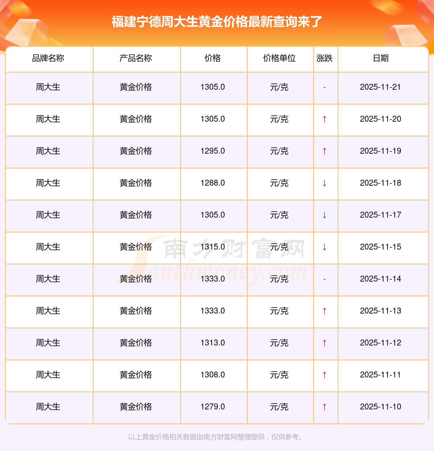 福建宁德周大生黄金价格在 2025年11月22日为 1305.0元/克。