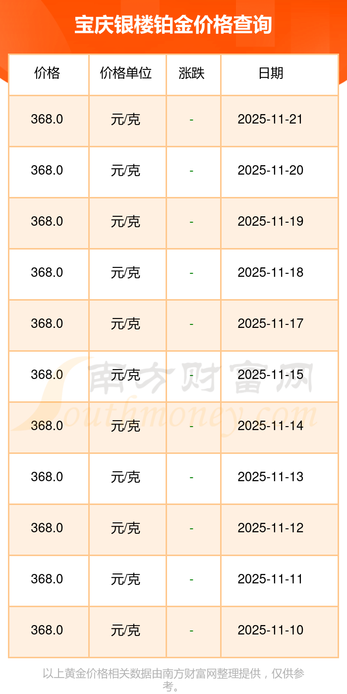 宝庆银楼 铂金价格今日最新的价位是368.0元/克。