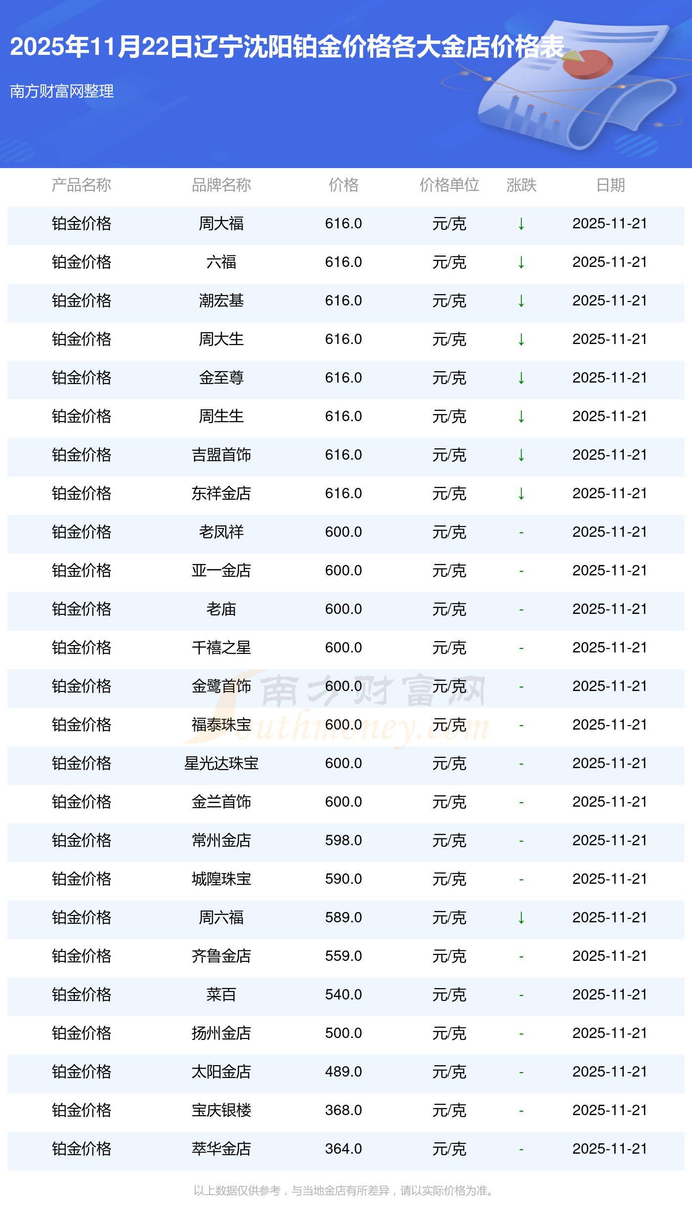 铂金价格首饰最新价格一般是多少?不同的珠宝店是不是价格都一样的?(附2025年11月22日辽宁沈阳各金店铂金价格)