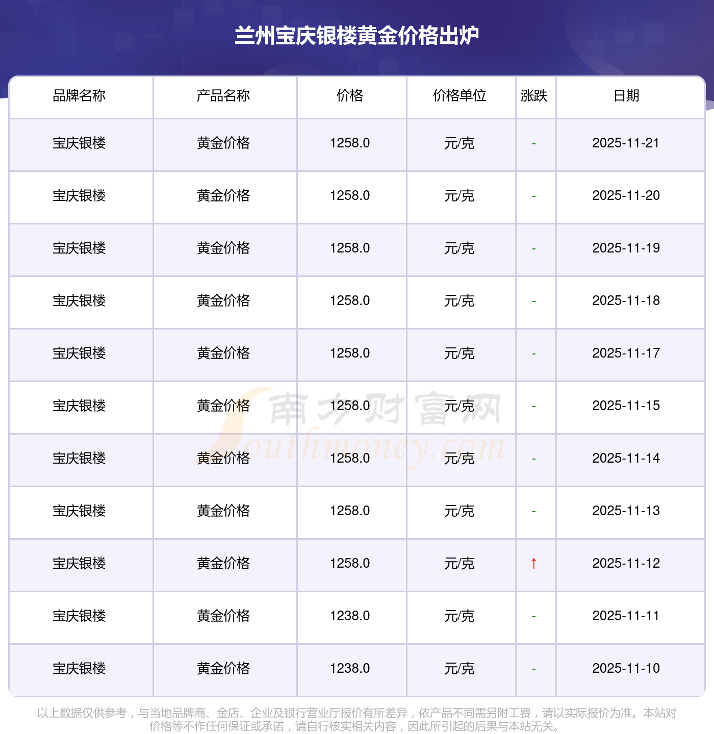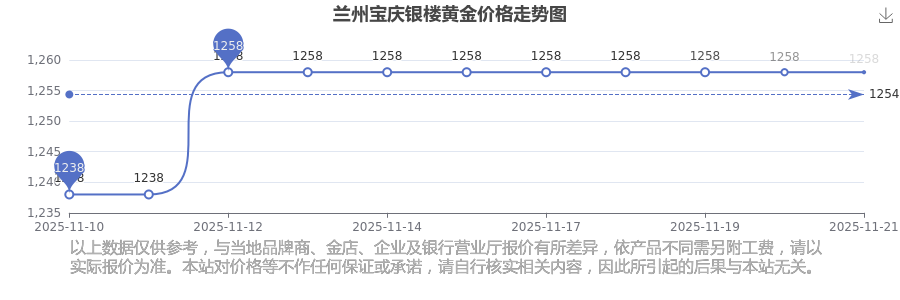 以上数据仅供参考,与当地品牌商、金店、企业及银行营业厅报价有所差异,依产品不同需另附工费,请以实际报价为准。本站对价格等不作任何保证或承诺,请自行核实相关内容,因此所引起的后果与本站无关。