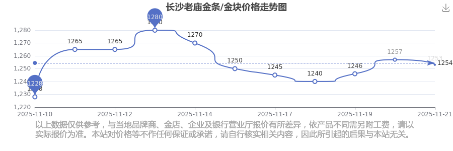 长沙老庙金条/金块价格在 2025年11月22日,其市场价格为 1253.0元/克。