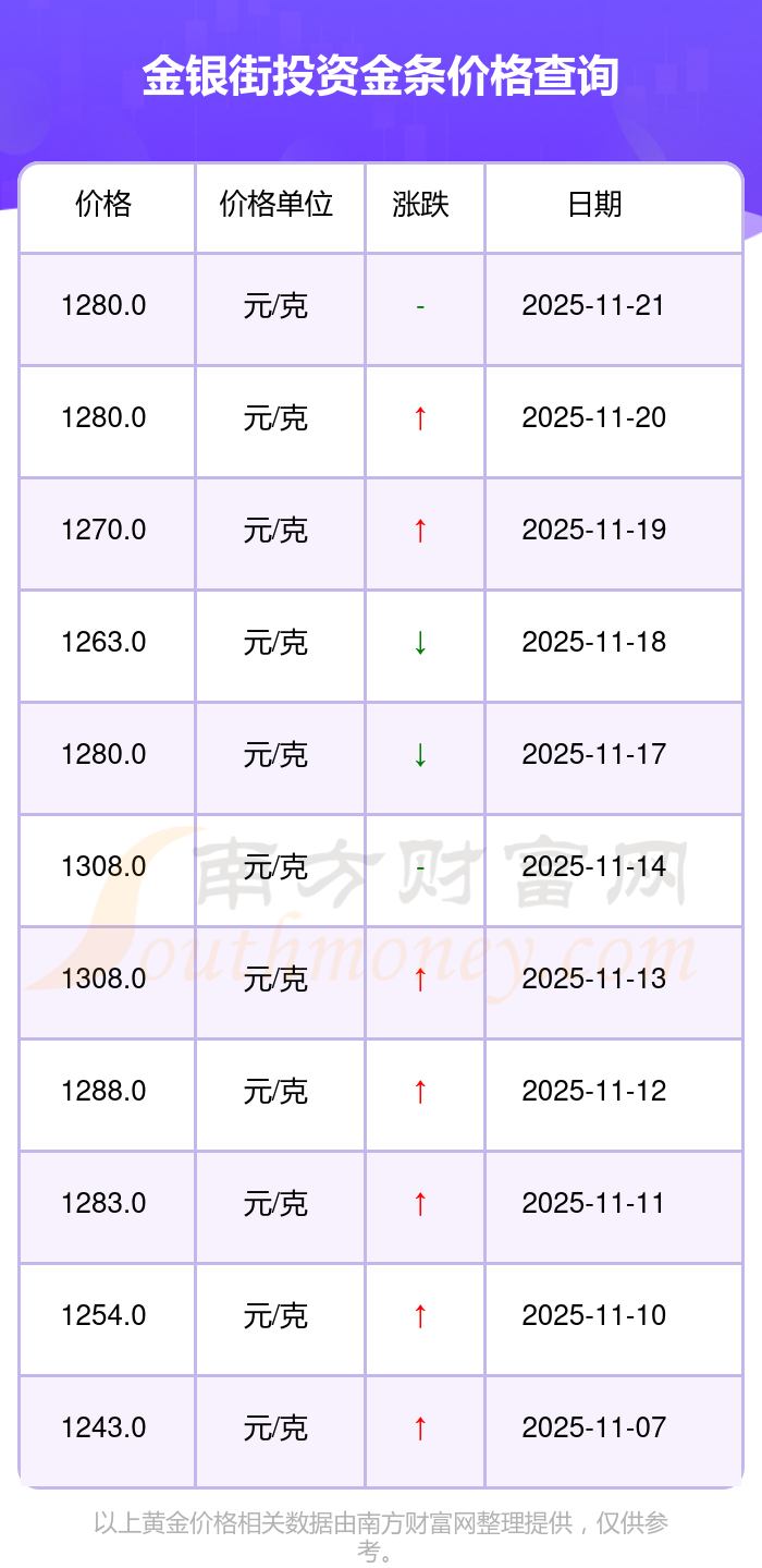 金银街投资金条价格多少钱一克呢?(2025年11月22日价格最新查询),一起来看看吧!