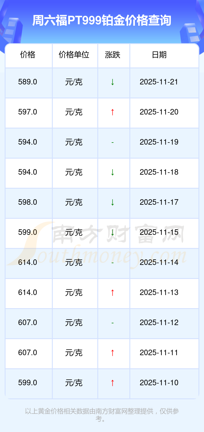 周六福今天PT999铂金价格多少一克?最新周六福查询,2025年11月22日周六福PT999铂金价格现在每克多少钱?最新周六福PT999铂金价格报价公布,一起来看看吧!