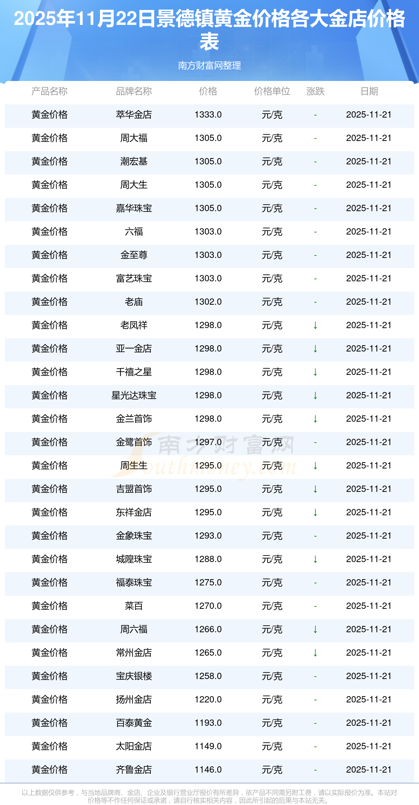 2025年11月22日,景德镇周大福、周大福、周大福、周大福、周大福、周大福、周大福、老凤祥、老凤祥、老凤祥、周六福等各大金店品牌黄金价格今日价格行情最新来了:周大福1305.0元/克、周大福616.0元/克、周大福1305.0元/克、周大福45110.0、周大福17570.0、周大福40690.0、周大福1143.0元/克、老凤祥1298.0元/克、老凤祥600.0元/克、老凤祥1298.0元/克、周六福1266.0元/克。