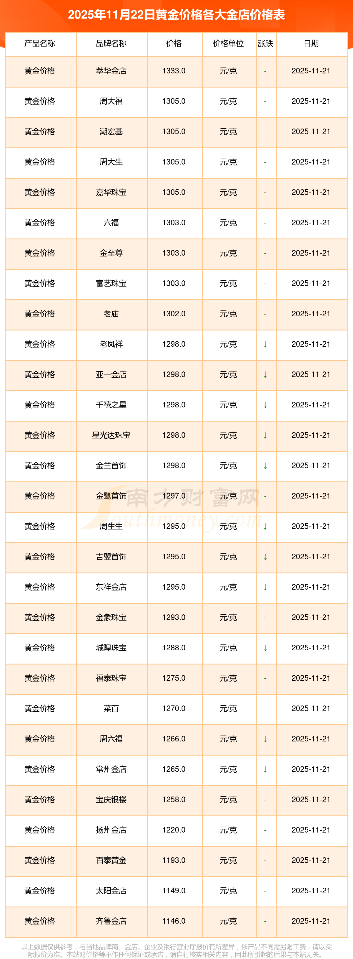 2025年11月22日周大福、周大福、周大福、周大福、周大福、周大福、周大福、老凤祥、老凤祥、老凤祥、周六福等各大金店品牌黄金价格最新价格如下:周大福黄金价格1305.0元/克,周大福铂金价格616.0元/克,周大福饰品金价(内地)1305.0元/克,周大福黄金饰品(香港)45110.0,周大福铂金价格(香港)17570.0,周大福金条价格(香港)40690.0,周大福金条金价(内地)1143.0元/克,老凤祥黄金价格1298.0元/克,老凤祥铂金价格600.0元/克,老凤祥足金价格1298.0元/克,周六福黄金价格1266.0元/克。