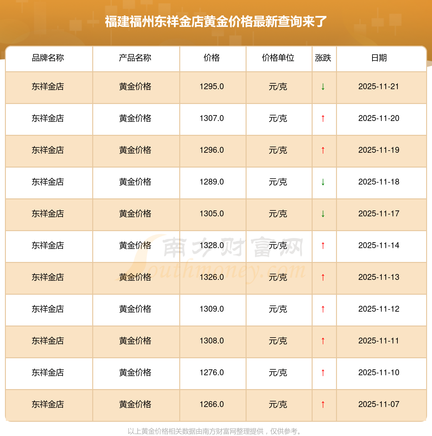 2025年11月22日当天,福建福州东祥金店黄金价格的单价是 1295.0元/克。