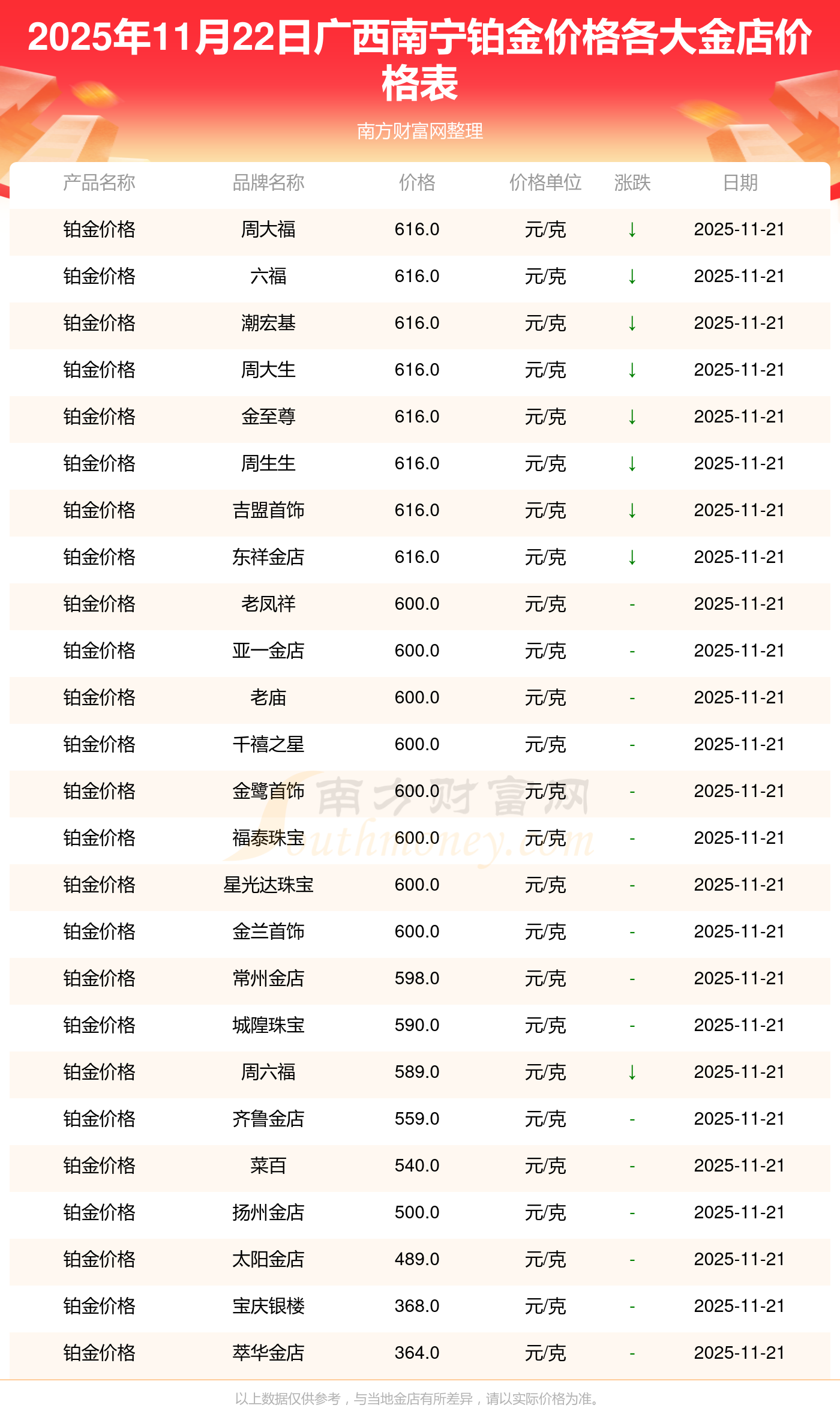 2025年11月22日广西南宁各大金店铂金价格最新价格:周大福1305.0元/克,周大福616.0元/克,周大福1305.0元/克,周大福45110.0,周大福17570.0,周大福40690.0,周大福1143.0元/克,老凤祥1298.0元/克,老凤祥600.0元/克,老凤祥1298.0元/克,周六福1266.0元/克。
