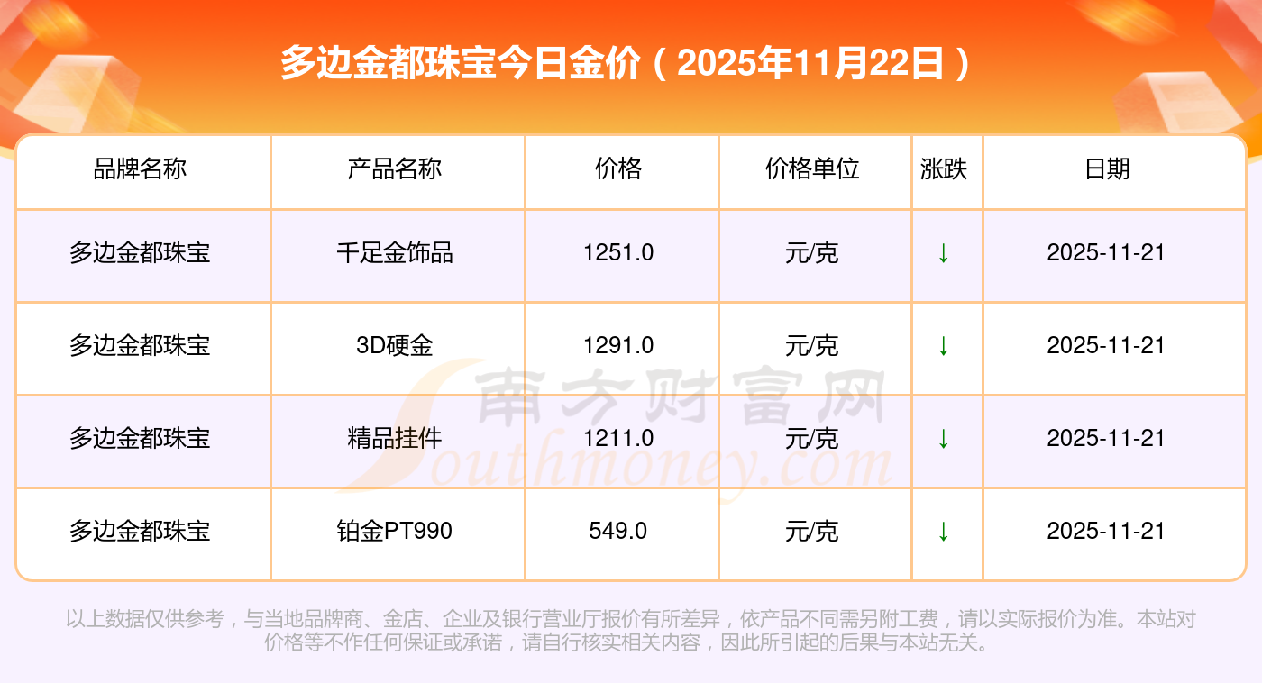 2025年11月22日多边金都珠宝金价查询:黄金价格1305.0元/克,铂金价格616.0元/克,饰品金价(内地)1305.0元/克,黄金饰品(香港)45110.0,铂金价格(香港)17570.0,金条价格(香港)40690.0,金条金价(内地)1143.0元/克,黄金价格1298.0元/克,铂金价格600.0元/克,足金价格1298.0元/克,黄金价格1266.0元/克。