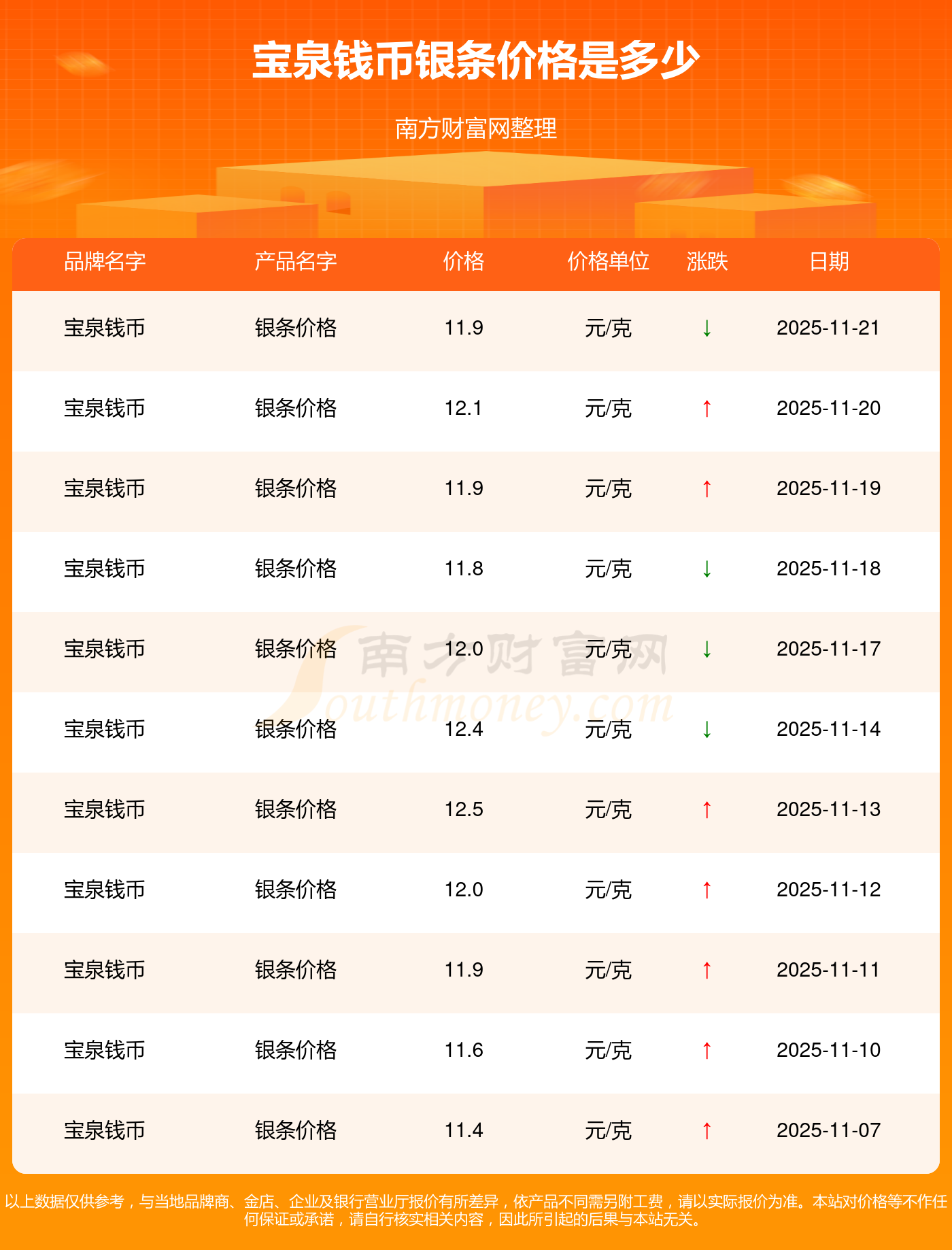 最新数据表明,宝泉钱币今日 银条价格为11.9元/克。