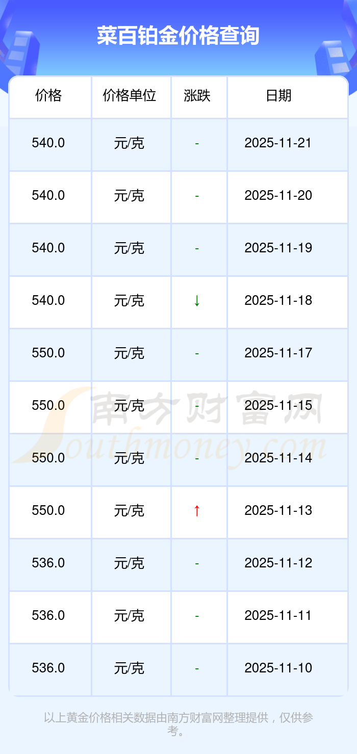 今日(2025年11月22日)菜百铂金价格的价格为540.0元/克。