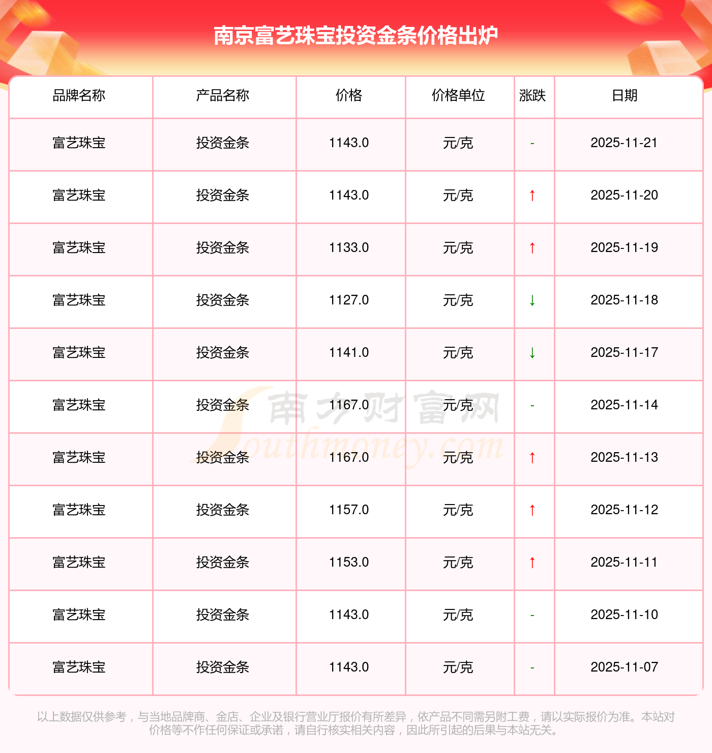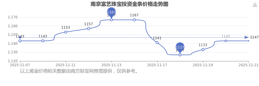 今日南京富艺珠宝投资金条价格是1143.0元/克。