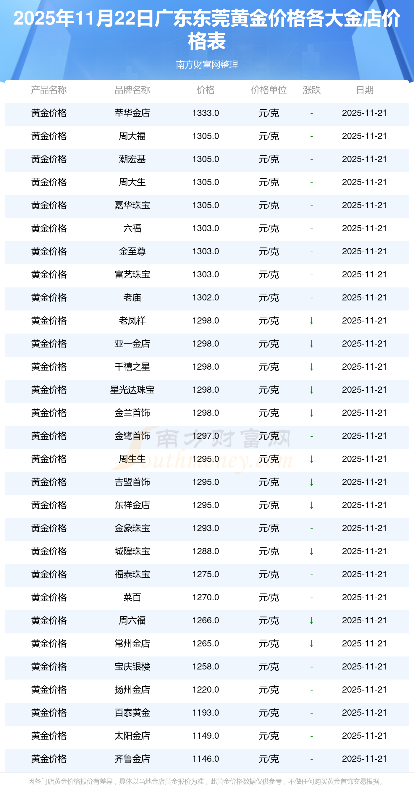2025年11月22日广东东莞各大金店黄金价格最新价格查询来了:周大福1305.0元/克,周大福616.0元/克,周大福1305.0元/克,周大福45110.0,周大福17570.0,周大福40690.0,周大福1143.0元/克,老凤祥1298.0元/克,老凤祥600.0元/克,老凤祥1298.0元/克,周六福1266.0元/克。