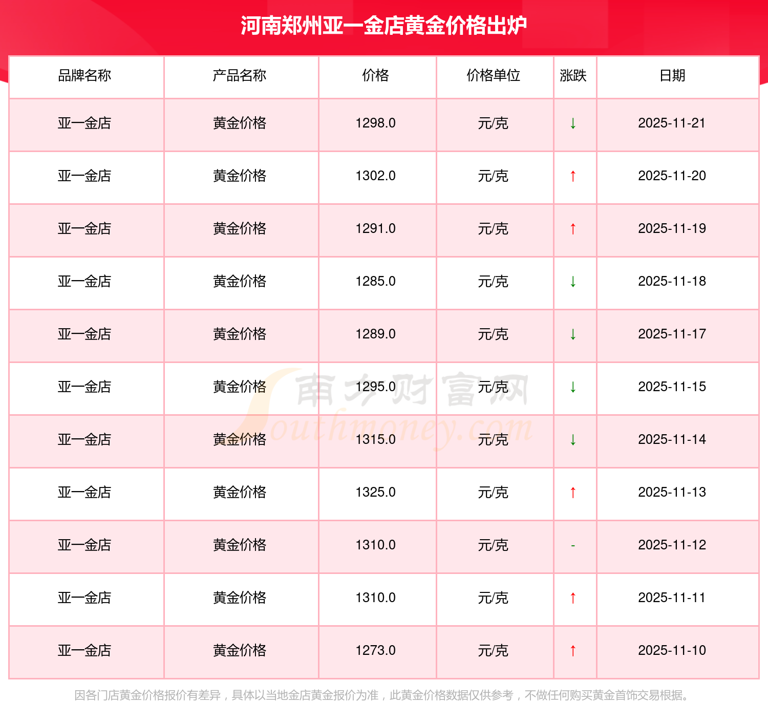 (2025年11月22日)今日河南郑州亚一金店黄金价格是1298.0元/克。
