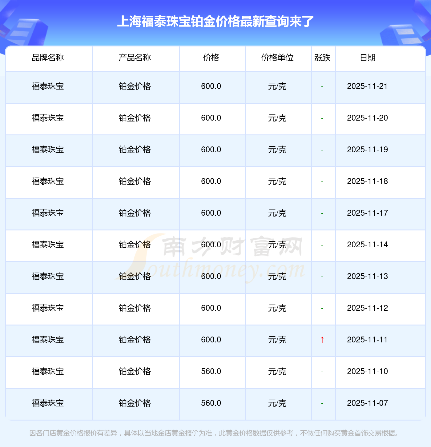 今日(2025年11月22日)上海福泰珠宝铂金价格:600.0元/克。