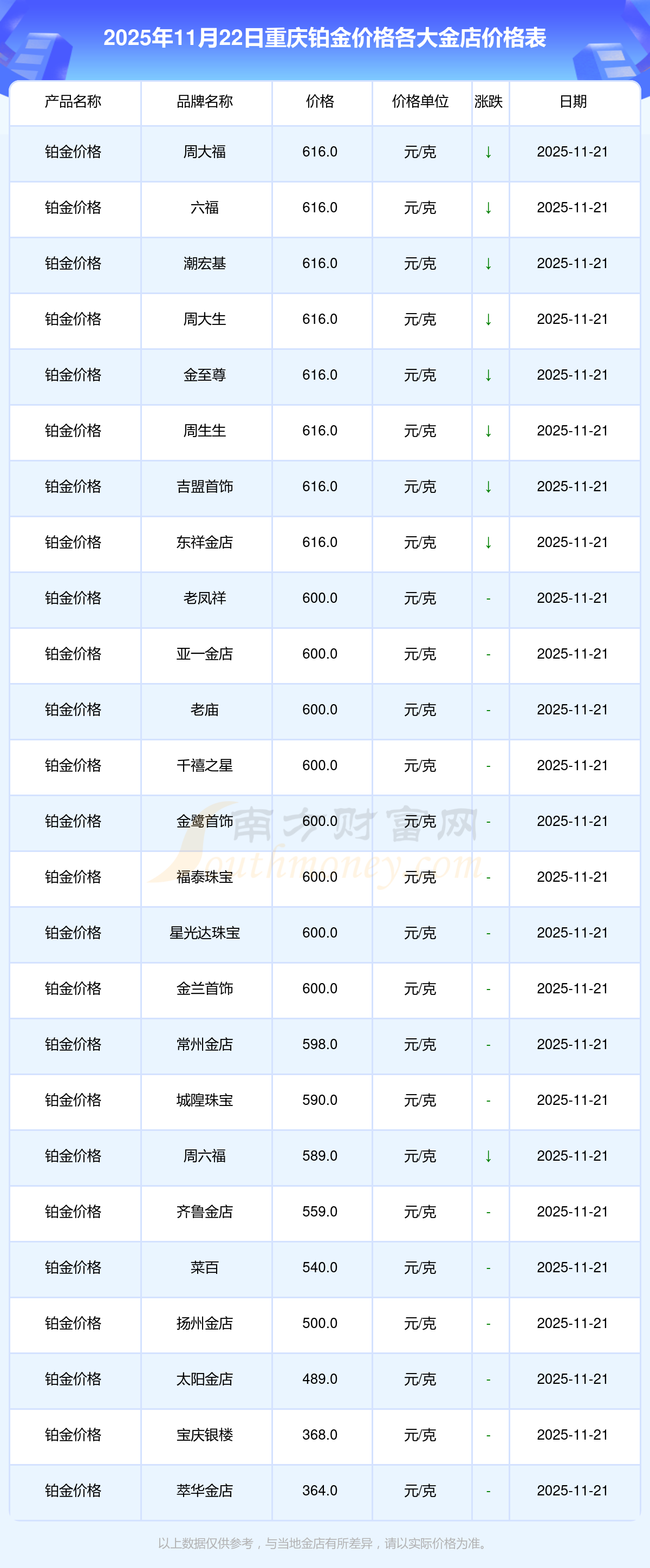 2025年11月22日重庆各大金店铂金价格最新价格:周大福1305.0元/克,周大福616.0元/克,周大福1305.0元/克,周大福45110.0,周大福17570.0,周大福40690.0,周大福1143.0元/克,老凤祥1298.0元/克,老凤祥600.0元/克,老凤祥1298.0元/克,周六福1266.0元/克。